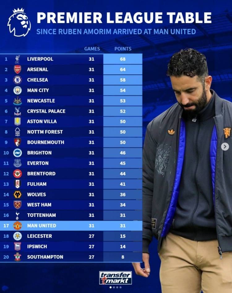 德转列自阿莫林执教曼联以来各队在英超取得的积分情况,阿莫林带队31轮仅取得31分,仅高于上赛季三支英超降级队,距第1名31轮取得68分的利物浦相差37分。