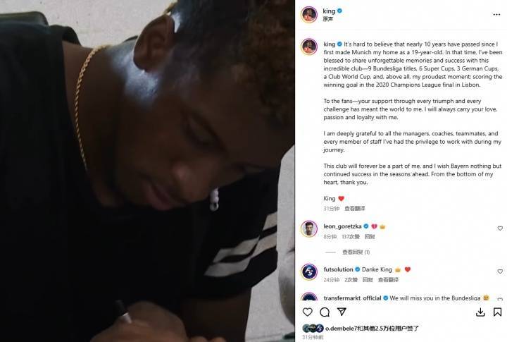难以置信,自我19岁将慕尼黑视为家园以来,近十年时光已悄然流逝。在此期间,我有幸与这家非凡的俱乐部共同创造了无数难忘回忆与辉煌成就——9座德甲冠军、6座超级杯、3座德国杯、1座世俱杯,以及我最引以为豪的时刻:2020年在里斯本欧冠决赛攻入制胜球。